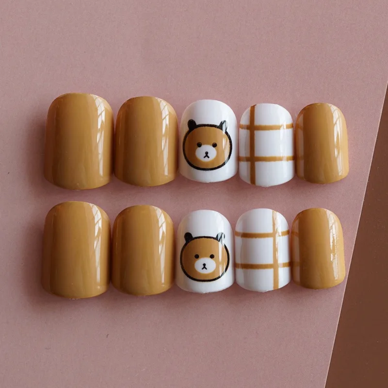wonderful 24 pcs Brown Press On Fake Nails With Cute Carton Designs Short Kawaii False Nail Tips Artificial F