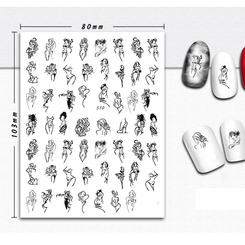 lower price 1 sheet Abstract Figure 3D Nail Stickers Black Line Woman Design Nail Sticker Rose Adhesive Sticker